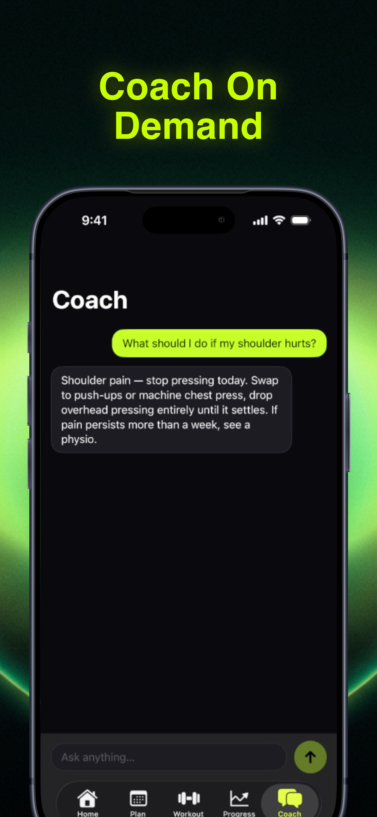 Ask why an exercise is in your plan, how to fix a form cue, or what to do when the rack is taken. Streamed answers, zero fluff.