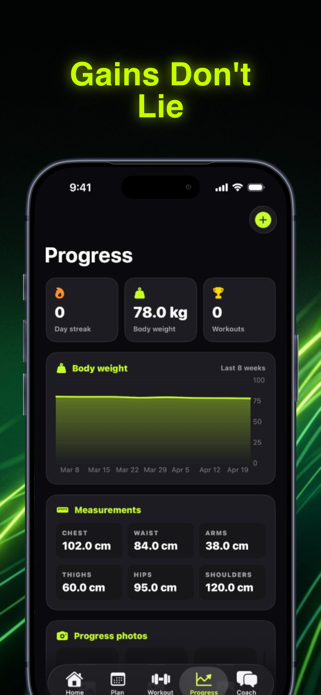 Body weight trend, measurements, PR feed, 1RM estimates, volume per muscle. The metrics that actually tell you whether the plan is working.