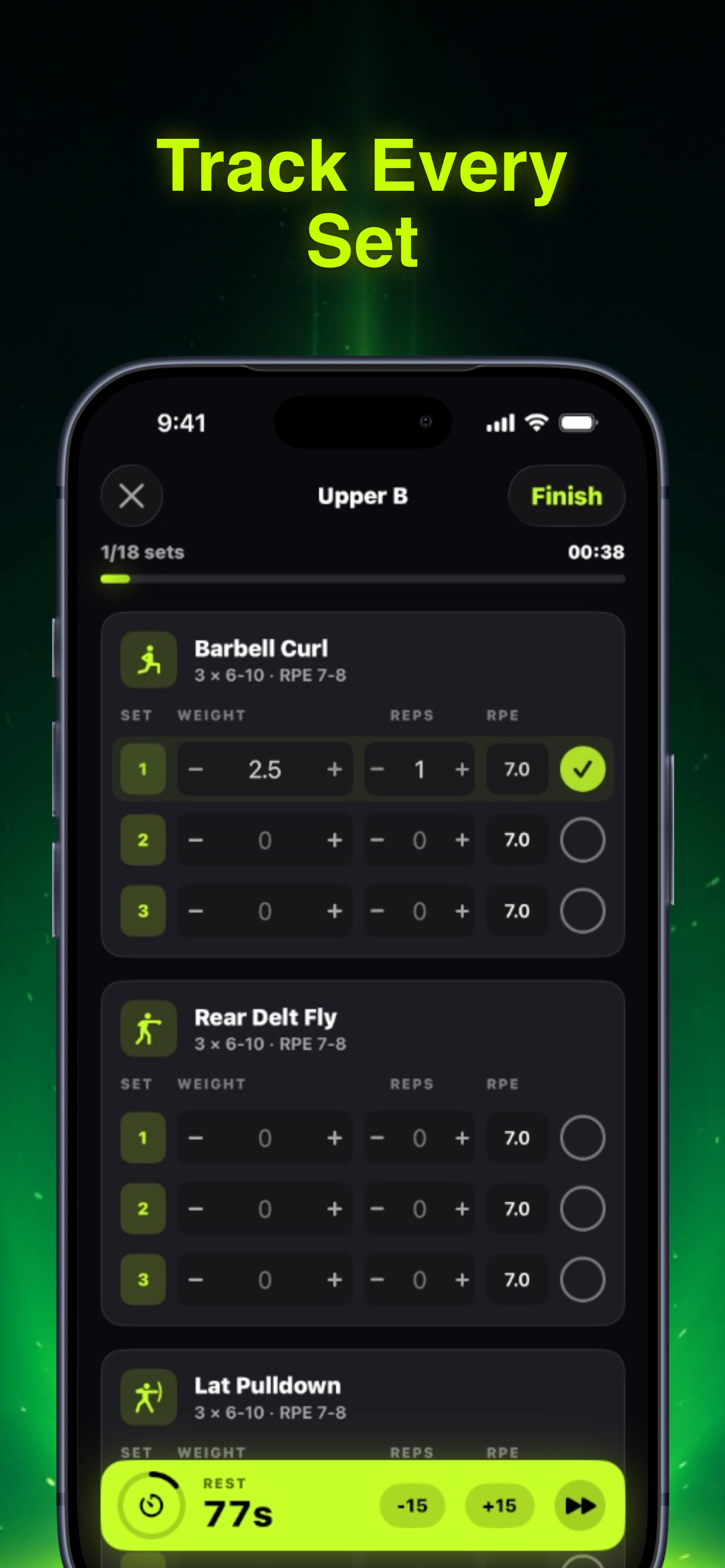 Track every set, rep, and PR